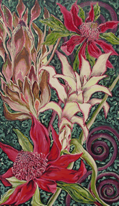 This image embraces the other worldliness found in the exotic detail of nature. Protea, pineapple, monkey tails all contribute to the right intoxicating energy of these forms. This painting will be a valued piece in any home, office, public space or corporate collection.
