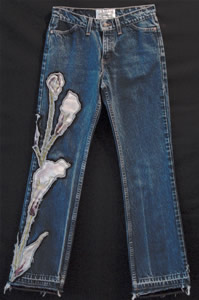 Graceful calla lilies soar up from the ground enveloping your form like an image from a Diego Rivera painting. A strong spirit will be accentuated as you wear your art. Have fun looking fabulous! Be one of a kind in GreenHouse Denim.